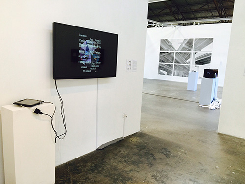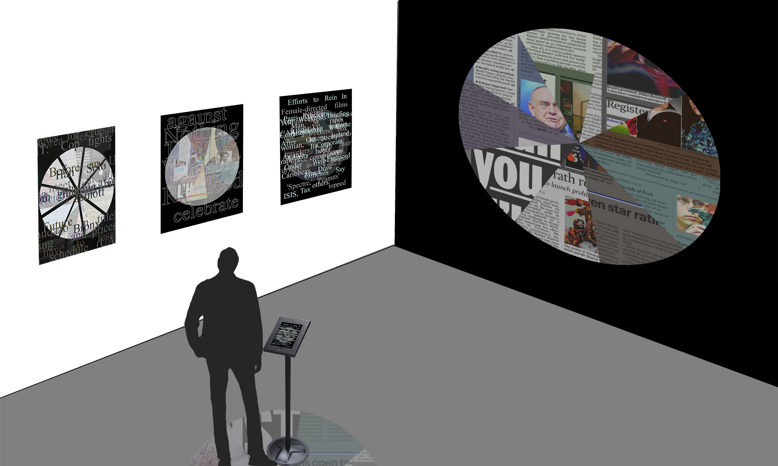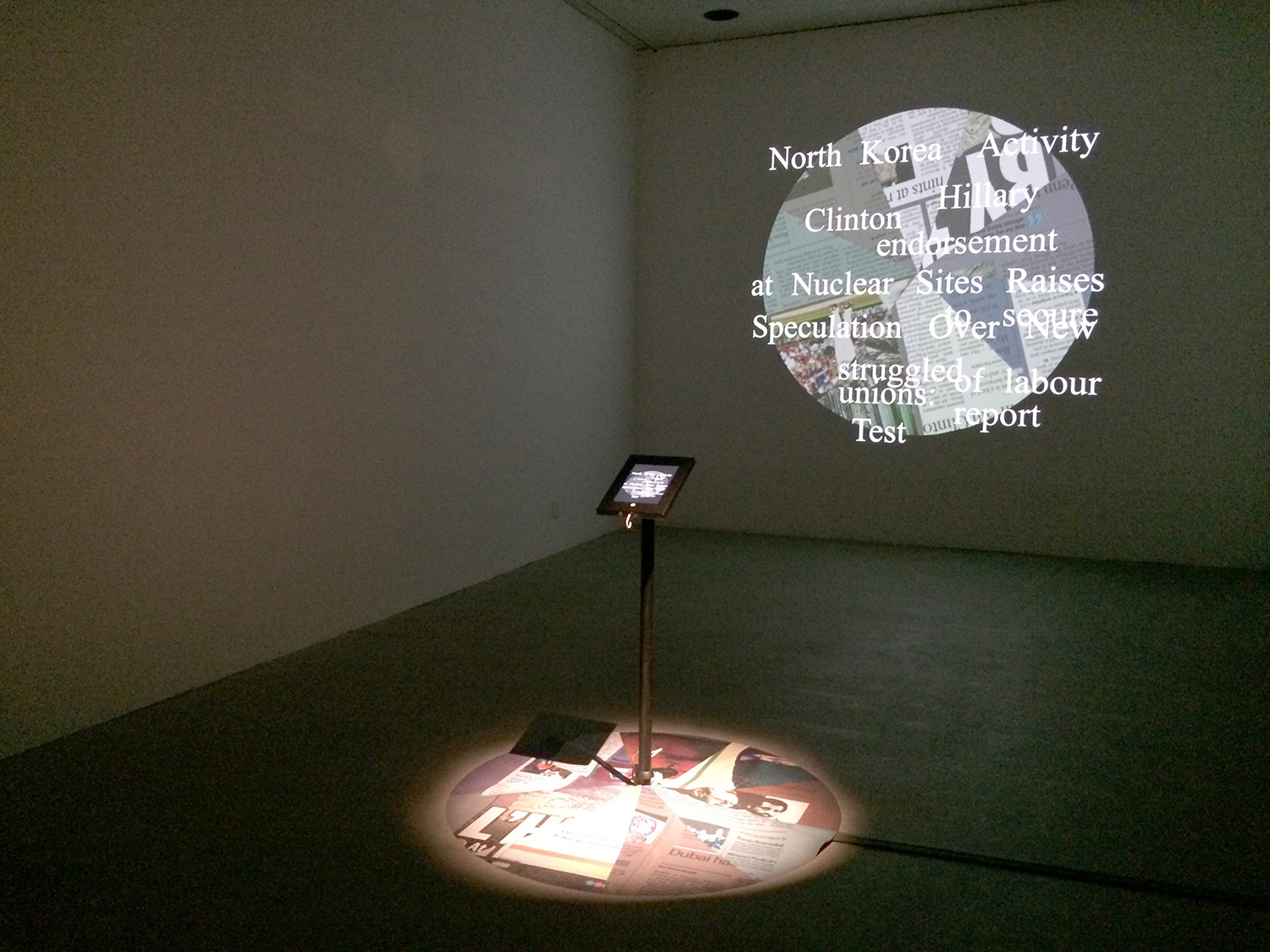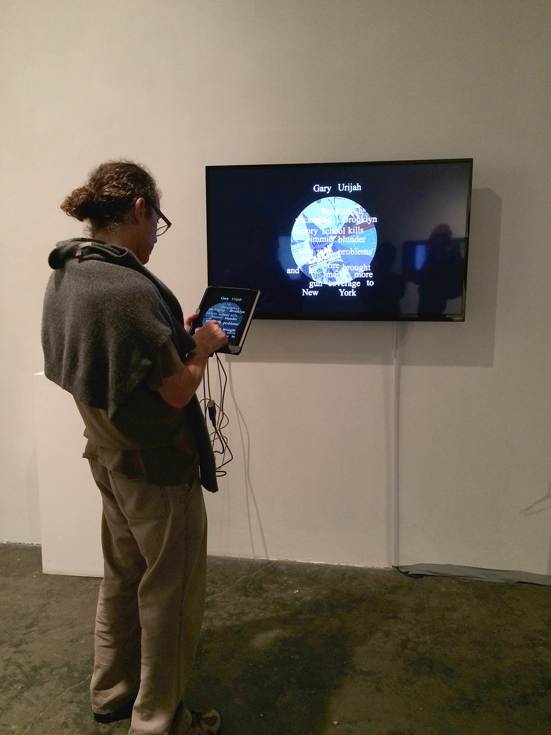 News Wheel As presented in S/Election Los Angeles Municipal Art Gallery October 16, 2016 - January 8, 2017 News Wheel is an interactive app that explores the poetics of ever changing news headlines. It begins as a static disk divided into nine sections each representing a different news source and tinted a different color. The sources include: Asian Age, The Guardian, The Los Angeles Times, The National, New York Daily News, The New York Times, The Philadelphia Inquirer, The Wall Street Journal and The Washington Post. On the iPad or iPhone when the app is launched, tapping anywhere on the screen causes the wheel to spin. Another tap stops the wheel and suddenly a headline in one of the nine pre-selected colors appears on the screen. This playful interface invites users to start and stop the wheel eventually filling the screen with a collage of current headlines. Individual words can be deleted and repositioned so users can create their own poems from this content. In addition, dragging one's finger across the screen creates an animated chain of fragmented and poetic text derived from today's headline news. News Wheel is a creative and poetic way to view, juxtapose and interpret world events from myriad and divergent sources. Click here for the free News Wheel app. Code and Noise, Arena 1 Gallery, Santa Monica, CA, September 8 - October 9, 2016 ![]() ![]() ![]() News Wheel Installation specs
