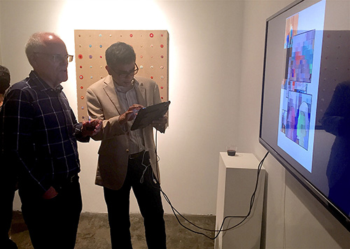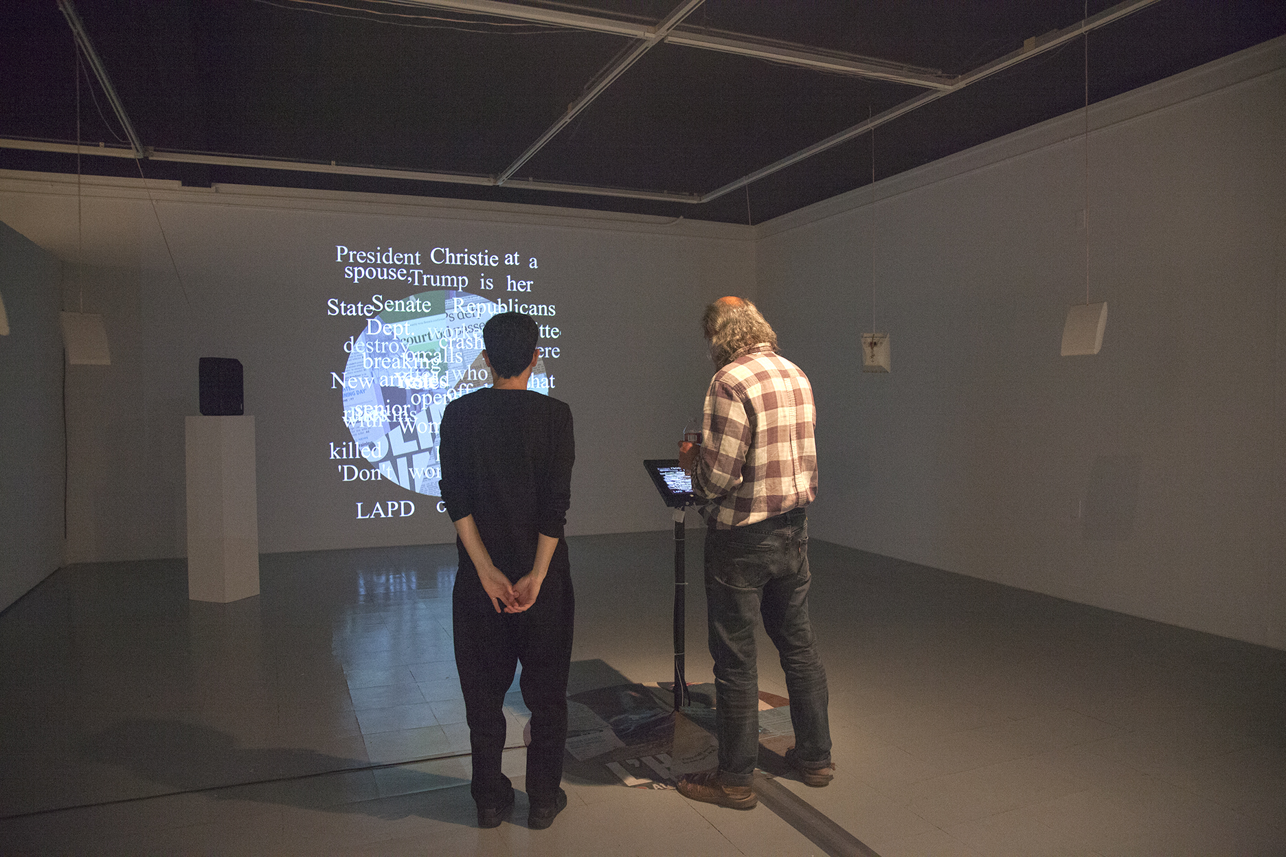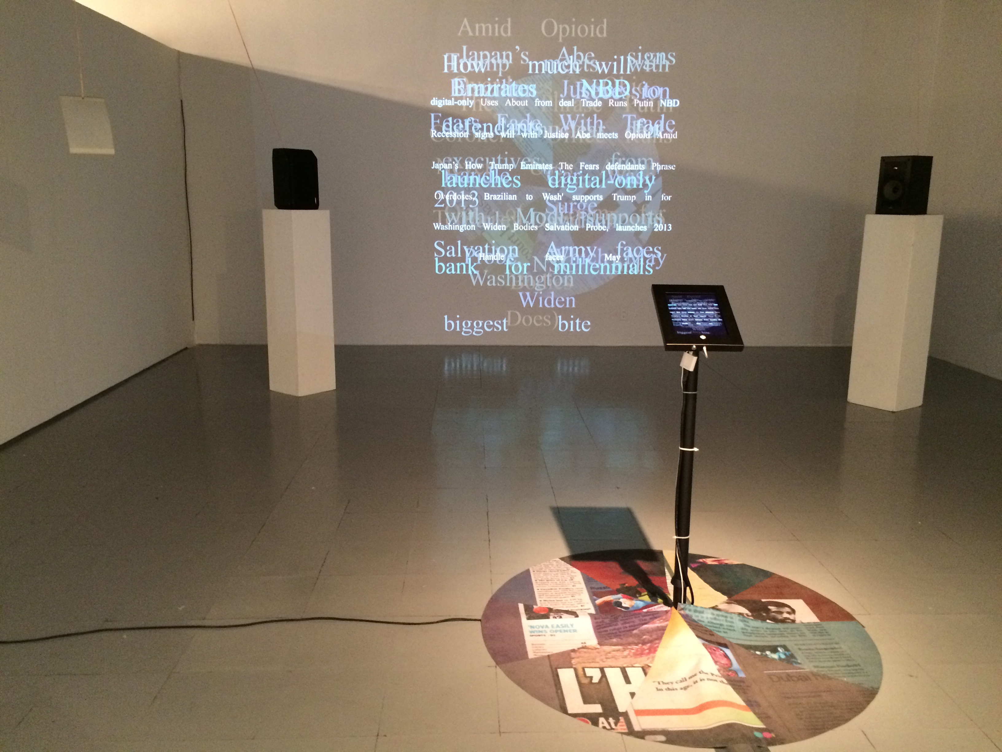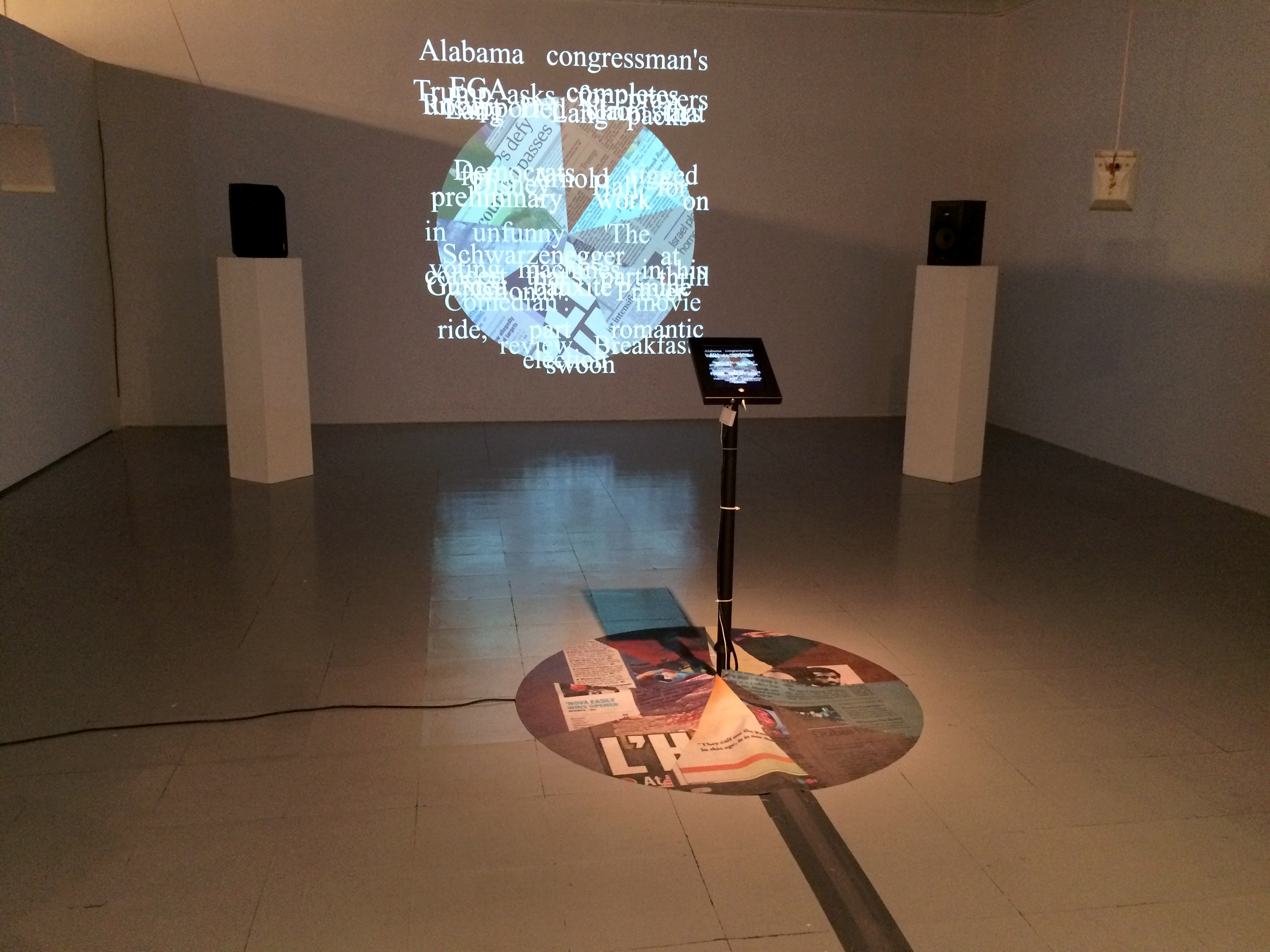 News Wheel as presented at Long Beach City College combines Jody Zellen's graphical interface with Daniel Rothman's audio installation, literally spinning the traditional newspaper and radio platforms for news reportage, through their web-based mediums. Projected on the wall as a spinning pie is a news wheel accessing 9 popular printed international news outlets. Gallery visitors touch an iPad screen in the center of the room to stop it, yielding their headlines in real time, which she/he may rearrange by dragging words for relevance or poetic content to create a news haiku, like a Duchamp cut-up. Around the space are 8 small loudspeakers, from which news from 8 radio stations (at low volume) spin from speaker to speaker, at the same rate as the projected pie. The spinning audio stops when the pie is stopped--one station per channel--and their composite audio can be aurally perceived as whatever local, national, international, and fake environment is broadcast at that time. News Wheel was programmed by Z Sweedyk and made possible via a 2016 artist fellowship from the City of Santa Monica. |